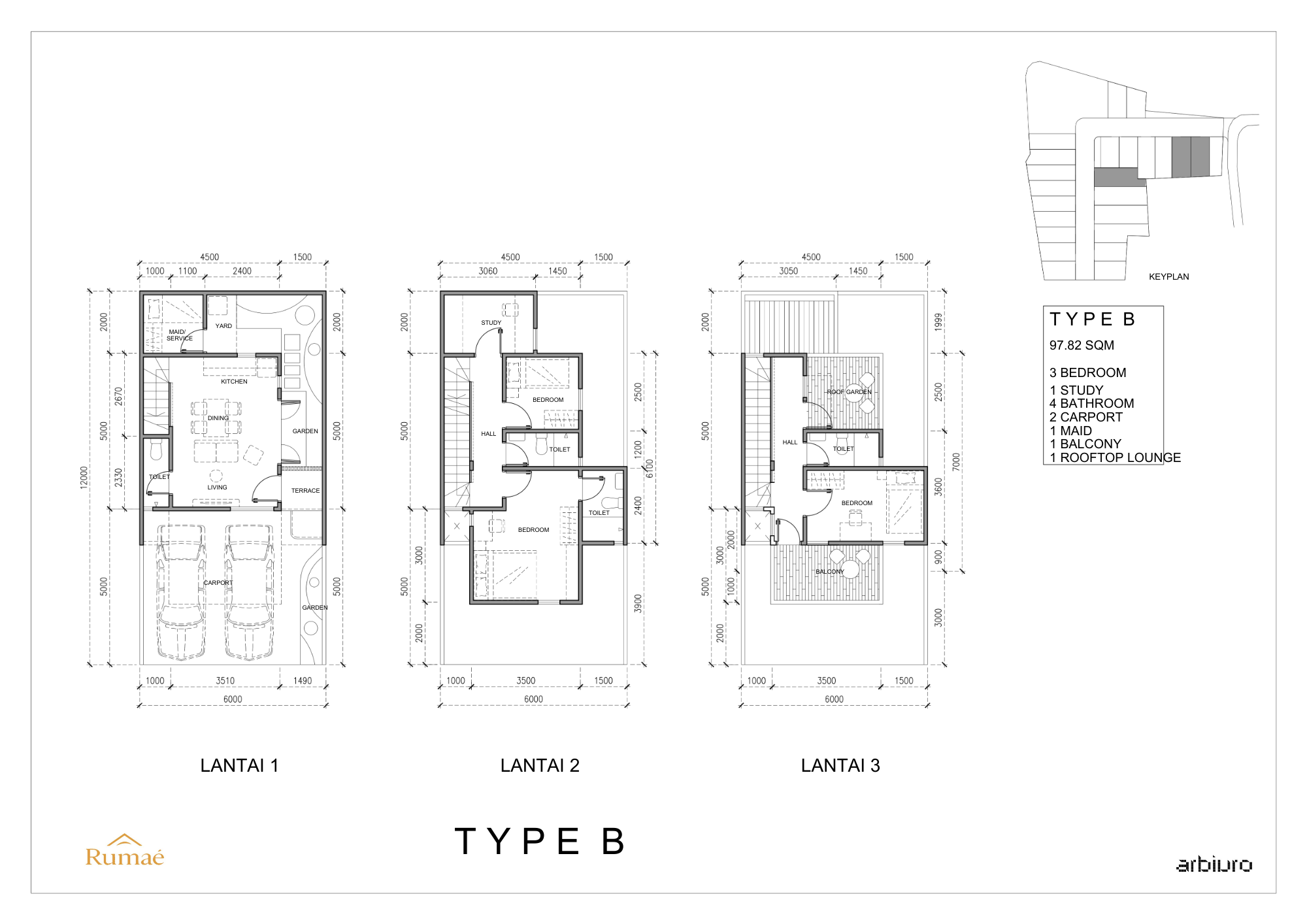Tipe B menawarkan hunian dengan ruang yang lebih luas dan fleksibel, ideal bagi keluarga yang membutuhkan kenyamanan ekstra. Dengan luas 97 sqm, setiap sudut rumah dirancang dengan cermat untuk menghadirkan pengalaman tinggal yang modern dan fungsional.