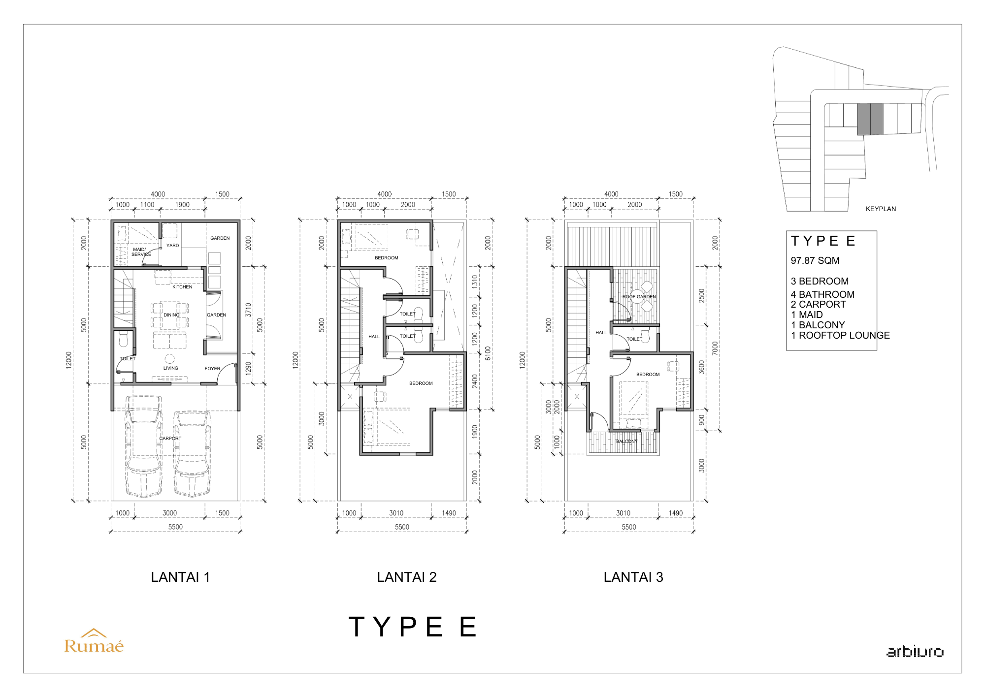 Sebagai fitur unggulan, terdapat rooftop lounge yang bisa dimanfaatkan sebagai area bersantai, menikmati udara terbuka, atau tempat berkumpul bersama keluarga dan teman. Ruang ini menjadi spot favorit untuk relaksasi maupun aktivitas ringan di luar ruangan tanpa meninggalkan kenyamanan rumah sendiri. Tipe E adalah hunian modern yang menawarkan fungsi optimal dan kenyamanan lengkap—solusi tepat bagi keluarga yang menginginkan rumah praktis namun tetap bergaya.
